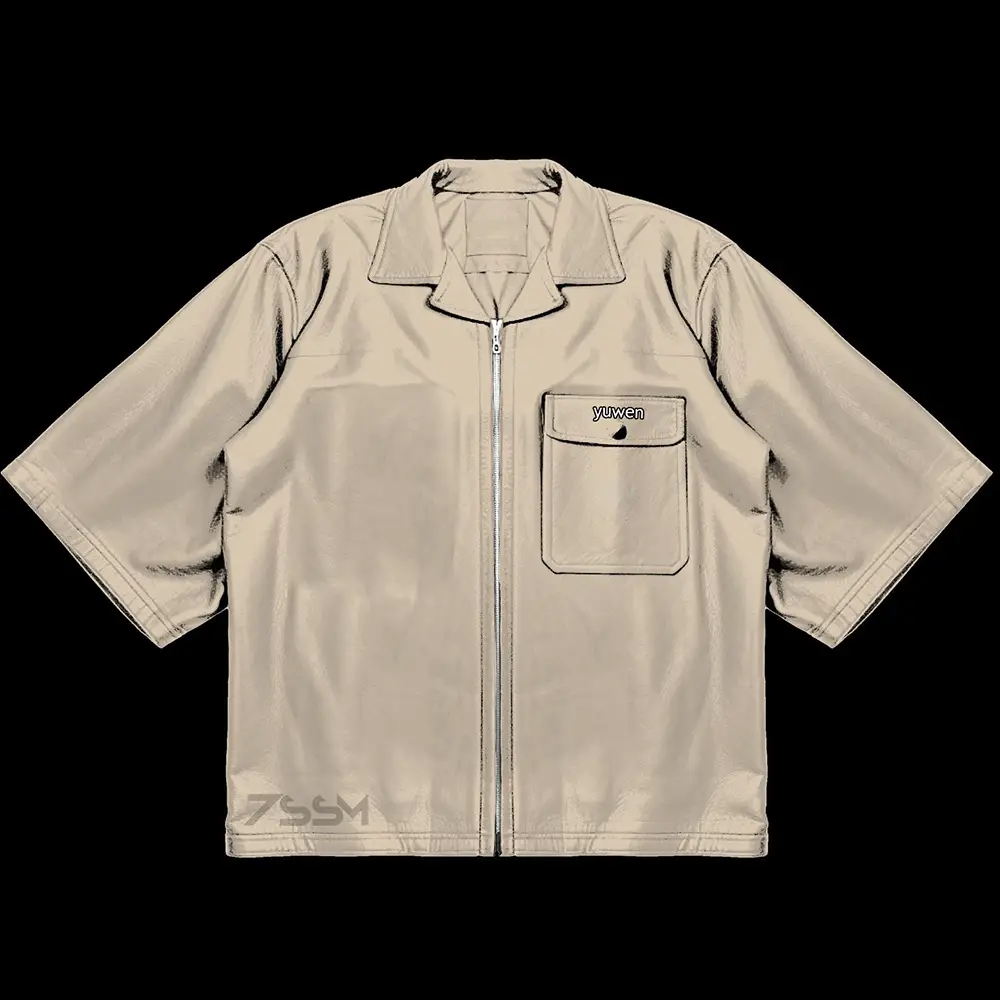Custom Logo Summer Men's Boxy Pu Leather Zip-up Shirt with Lapel Collar and Blank Chest Pockets Short Sleeve Satin Fabric