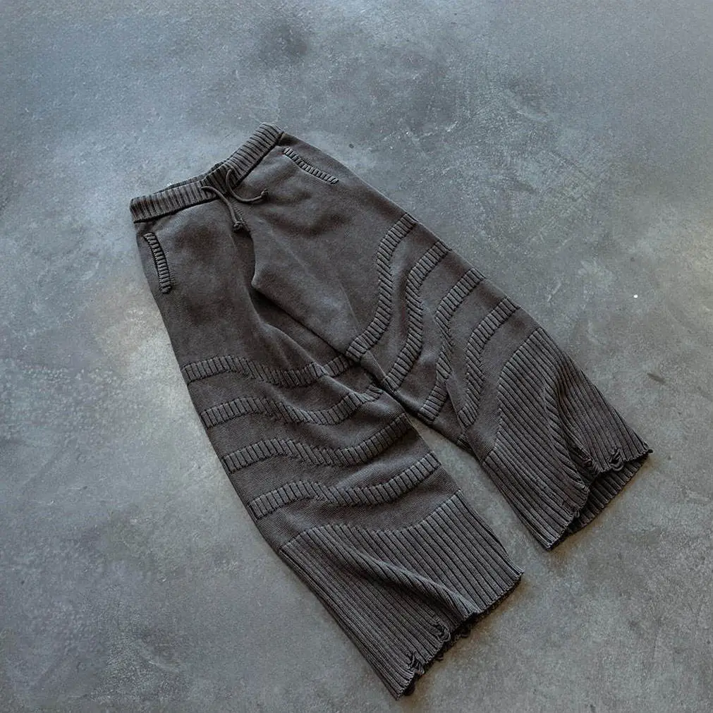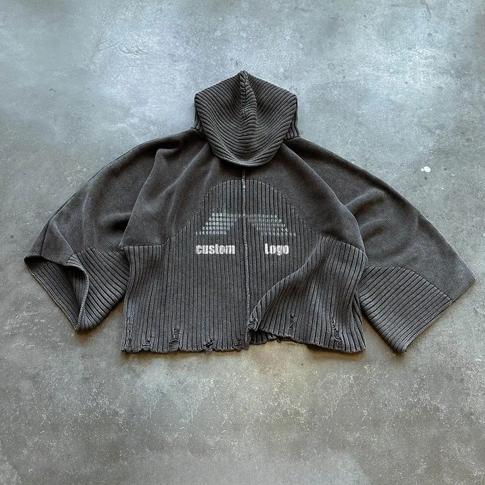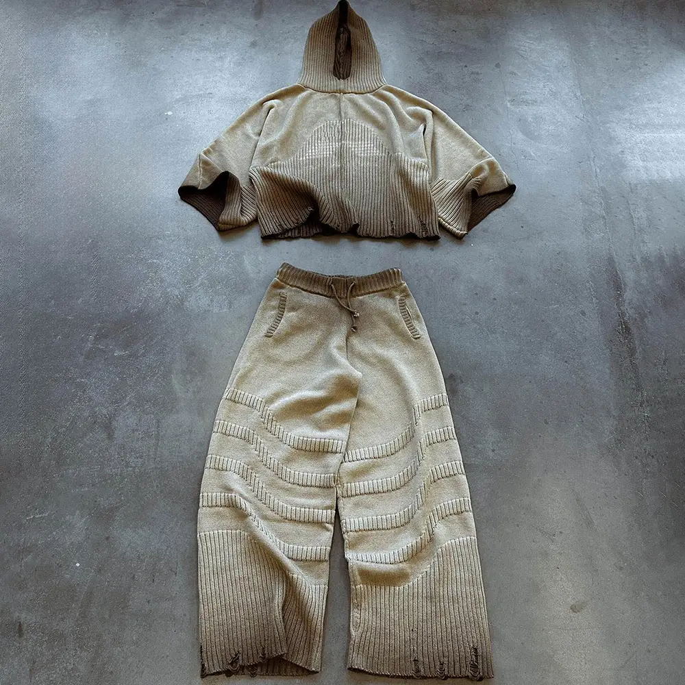 OEM Custom Men Vintage Washed Distressed Two-Piece Tracksuit Street Wear Knit Ribbed Hoodie Sweater Jogger Pants Set for Men