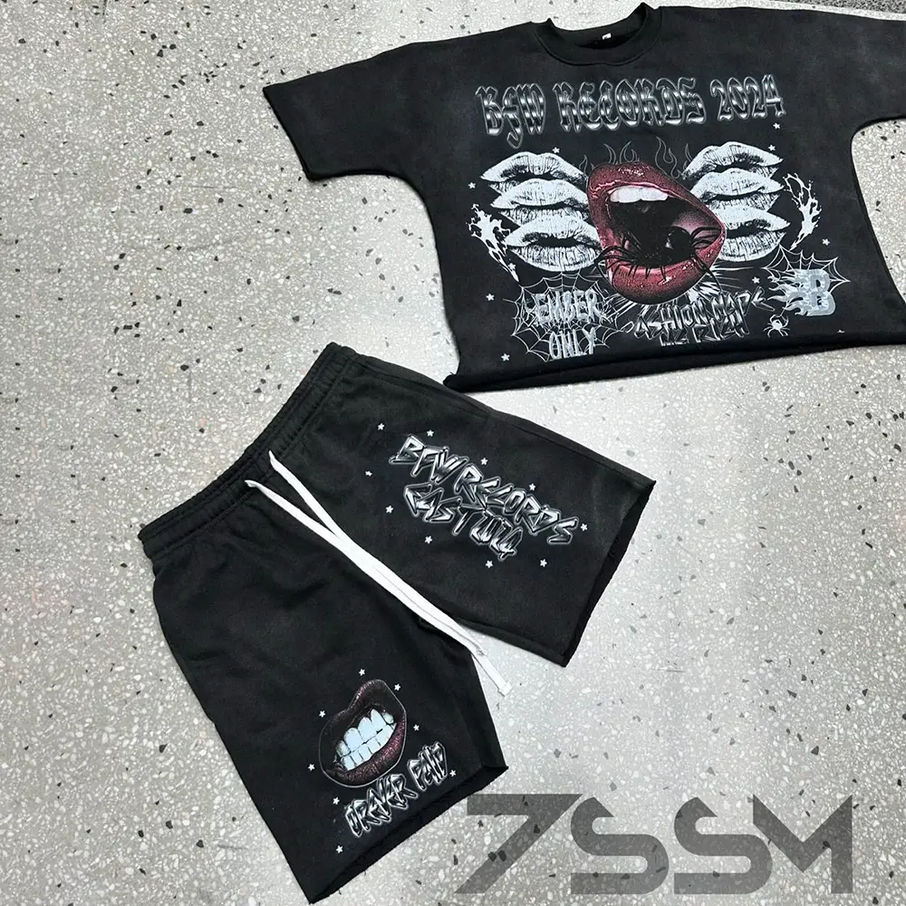 OEM Custom Acid Wash Boxy DTG Print Vintage Cropped T Shirts Short Sleeve Tshirt Shorts Set Men's Streetwear Hip Hop Summer