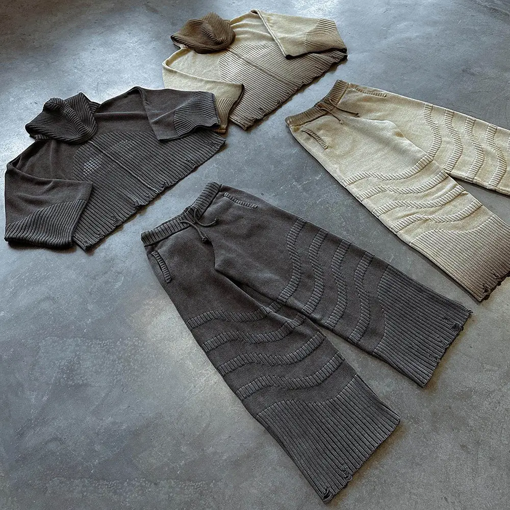 OEM Custom Men Vintage Washed Distressed Two-Piece Tracksuit Street Wear Knit Ribbed Hoodie Sweater Jogger Pants Set for Men