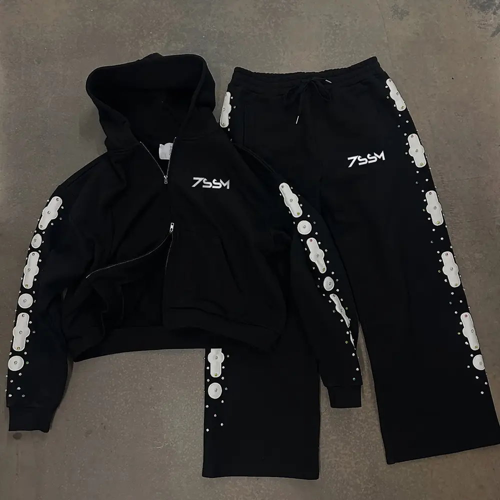 Custom Men's Winter Streetwear Oversized Sweatpants Double Zip Hoodie Set Rhinestone Patch Joggers Embroidered Sweat Suit